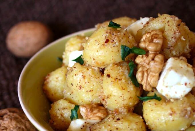 <p style="text-align: center">Prepare the pesto by blending the zucchini, arugula, walnuts, pecorino cheese, oil and a tablespoon of water. Cook the <a href="https://www.mammaemma.it/en/potato-gnocchi/potato-gnocchi/" target="_blank" rel="noopener">potato gnocchi mamma emma</a> for about 3 minutes with 100 ml of water.</p>