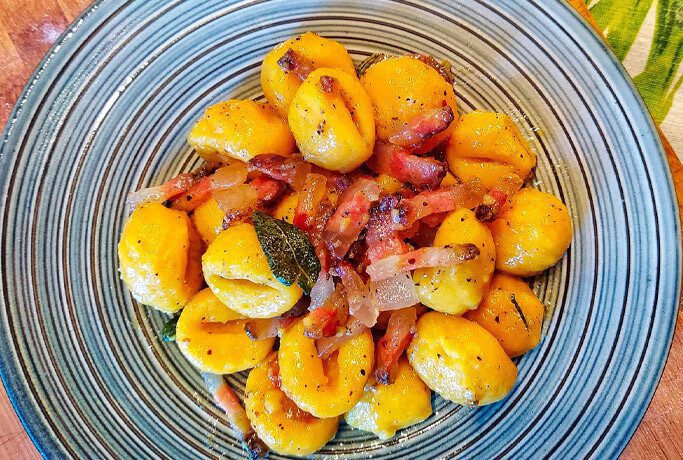 <p style="text-align: center"><span style="font-weight: 400">Our pumpkin gnocchi with cheek lard, sage and rosemary recipe is quick to prepare but also very tasty. It combines our pumpking gnocchi with a very special ingredient: the cheek lard. </span></p> <p style="text-align: center"><span style="font-weight: 400">Let’s start by cutting the cheek lard into strips. Then fry it in a pan and let it cook until it becomes crispy and crunchy. Set it aside.<br /> </span></p> <p style="text-align: center"><img class="size-full wp-image-4102" src="https://www.mammaemma.it/wp-content/uploads/2020/03/ricetta-guanciale.jpg" alt="Ricetta Guanciale" width="800" height="533" /></p> <p style="text-align: center"><span style="font-weight: 400">Stir the mamma emma pumpkin gnocchi in a pan with 100 ml of water. They’ll be ready in 3-4 minutes. Add some sage and rosemary and some parmesan or pecorino cheese to taste.  </span></p> <p style="text-align: center">Thanks to <a href="https://www.instagram.com/p/B7su381I6YG/">manu.bistrot</a></p>