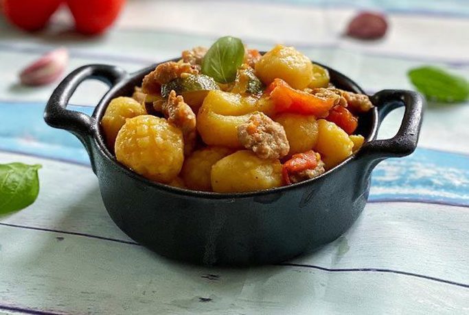 Spring potato gnocchi with zucchini, sausages and Pachino tomatoes
