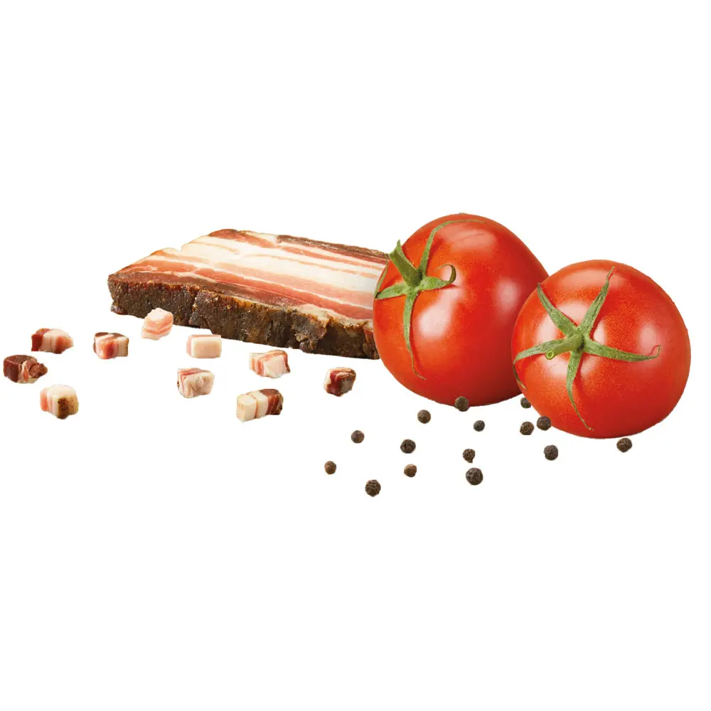The ingredients of our amatriciana sauce are: tomato puree 65.7 percent, smoked bacon 14.8 percent (pork, salt, spices, dextrose, preservative: sodium nitrite, antioxidant: sodium ascorbate), water, double tomato paste 3.9 percent, onions, extra virgin olive oil, salt, sugar, black pepper 0.1 percent. As simple and wholesome as grandma’s recipe, Amatriciana sauce smells of good things. It makes a last-minute lunch special; just open the jar and choose the pasta format you prefer.