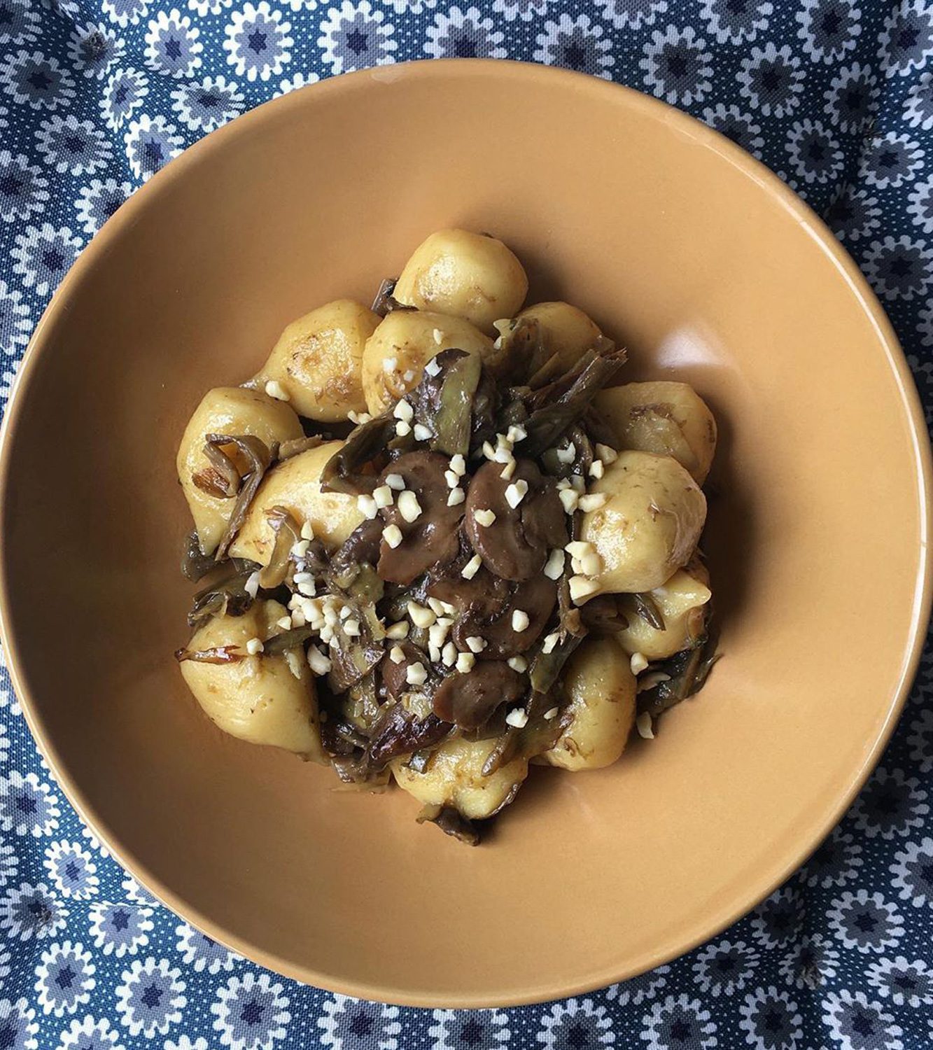 Gnocchi rellenos de Asiago y funghi porcini con alcachofas, setas y avellanas