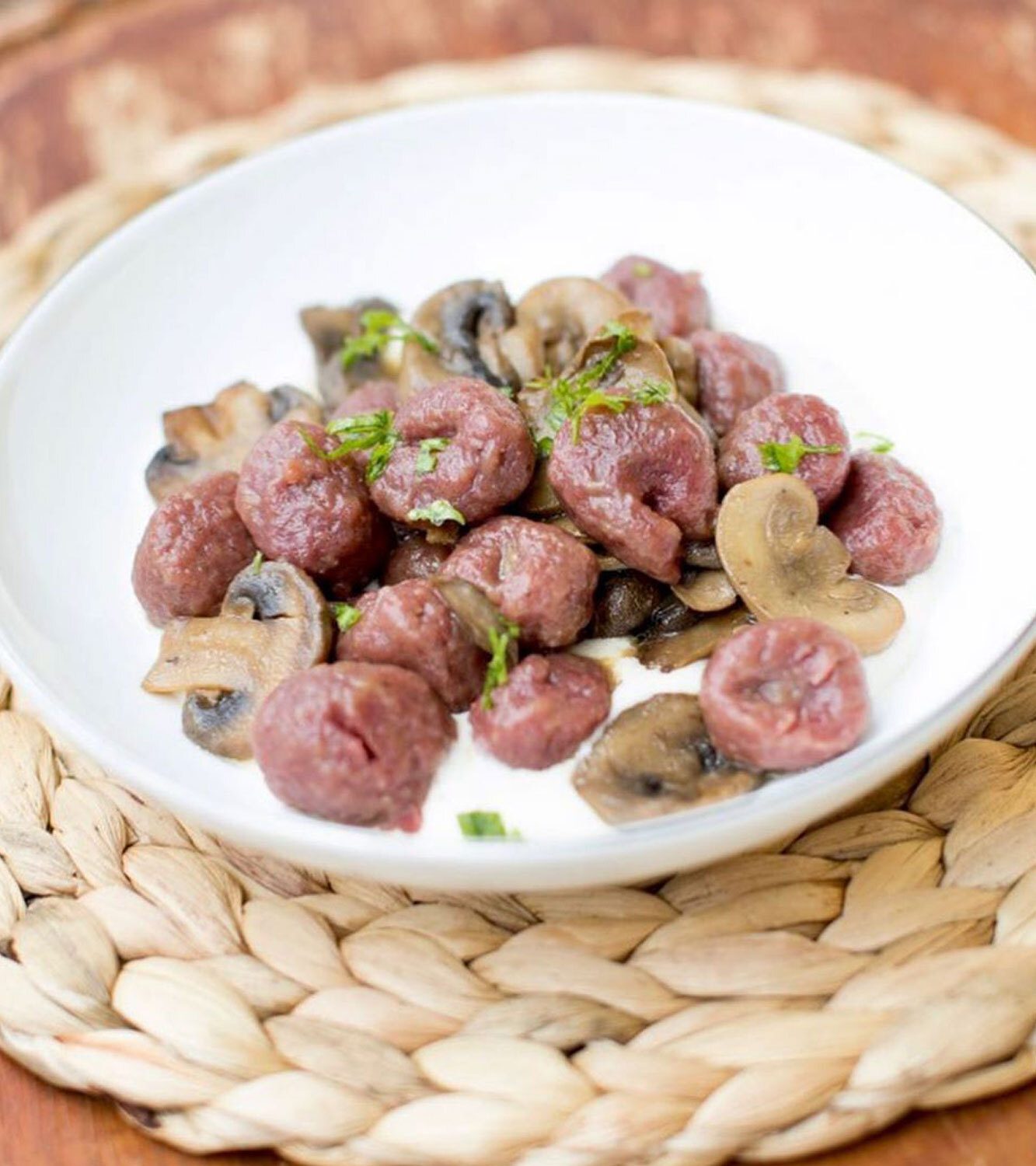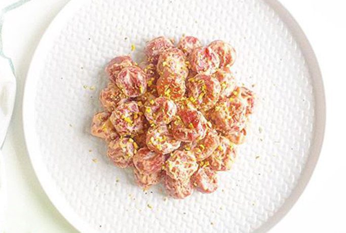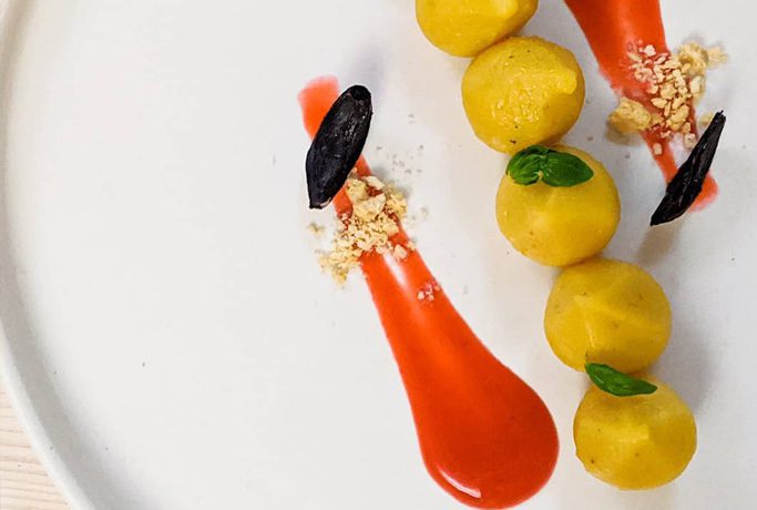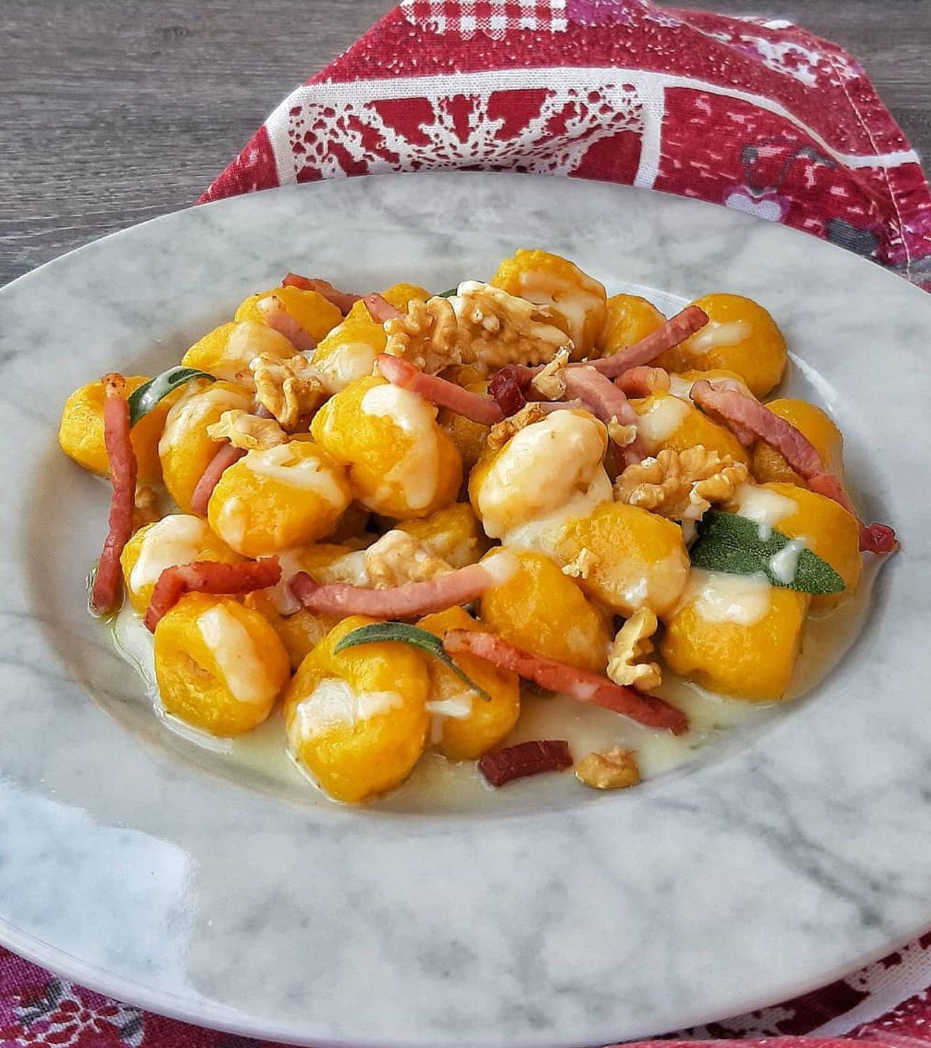 Gnocchi de papas con zapallo con aceite aromatizado con salvia, fondue de queso Gorgonzola y queso parmesano, nueces y speck crujiente en juliana