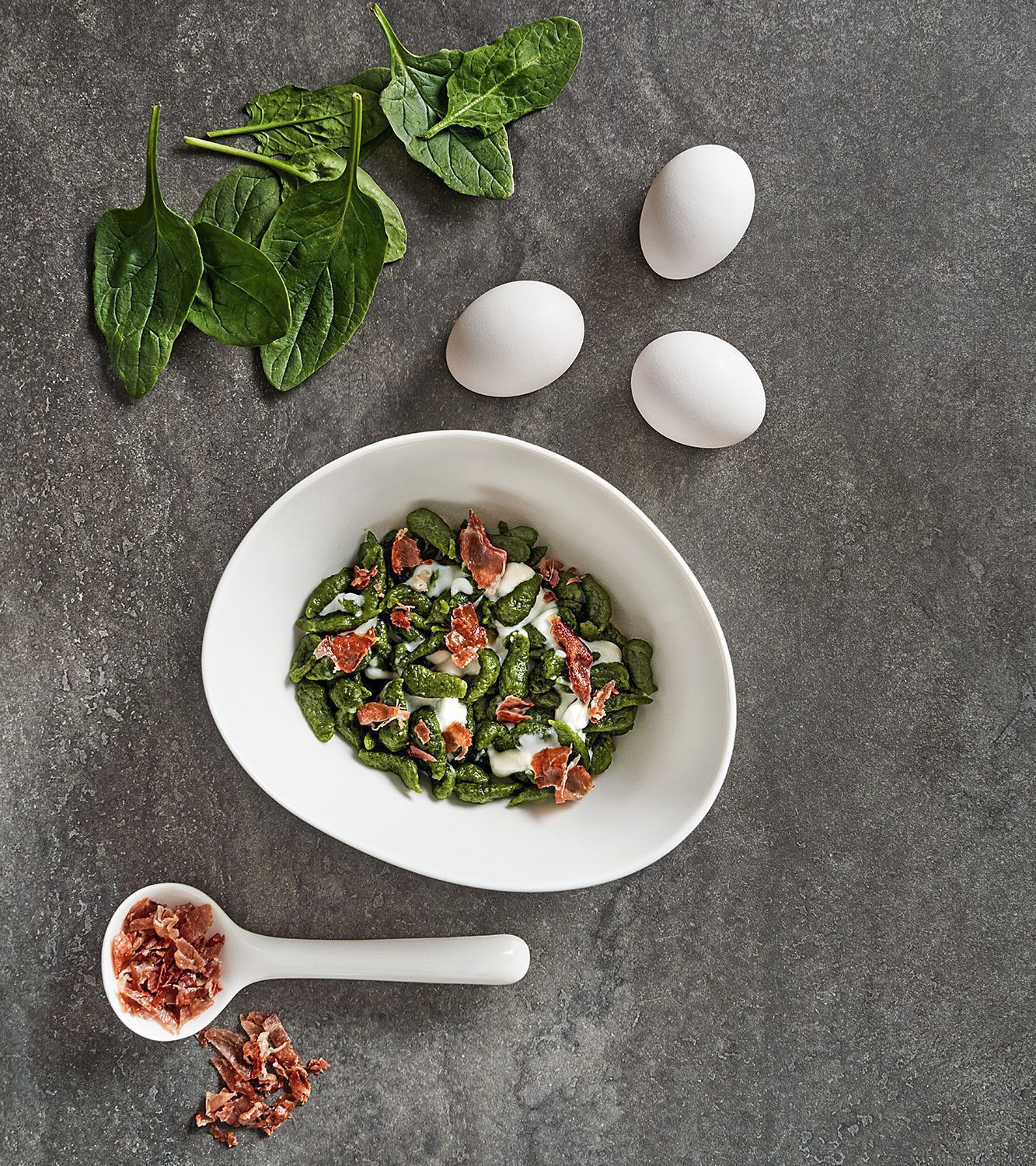 Happy Spätzle con crema de queso Castelmagno y jamón crujiente