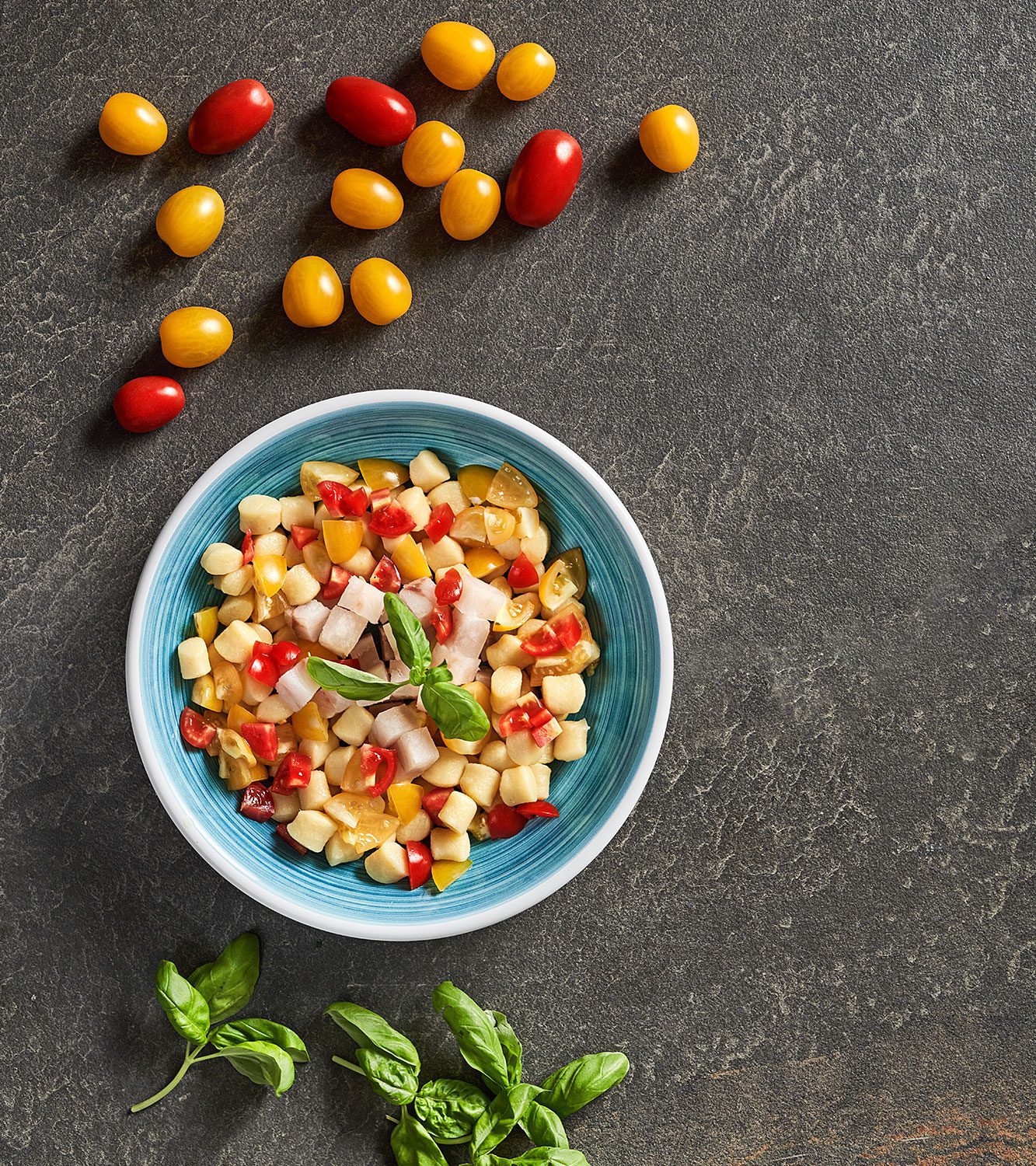 Mini gnocchi Happy con bacalao y tomates amarillos y rojos