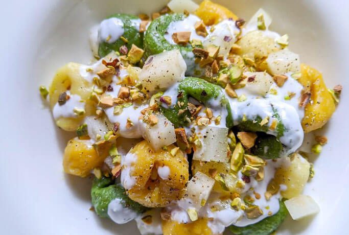 Gnocchi alla zucca con fonduta di gorgonzola, pere, polvere di cacao e ricotta affumicata