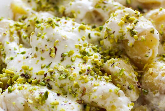 Gnocchi ripieni di Gorgonzola DOP con crema di Philadelphia e parmigiano e granella di pistacchi