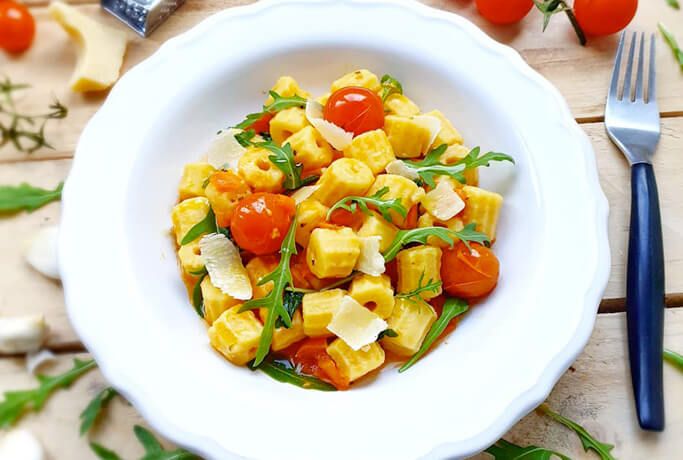 Nella stessa padella con il grasso del guanciale aggiungere acqua per la cottura degli gnocchi. Iniziare a mantecare con la salsa alle noci e guanciale, a finitura nel piatto aggiungere la rucola fritta.