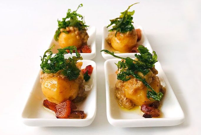 Gnocchi ripieni al gorgonzola con guanciale, pesto di noci e rucola fritta