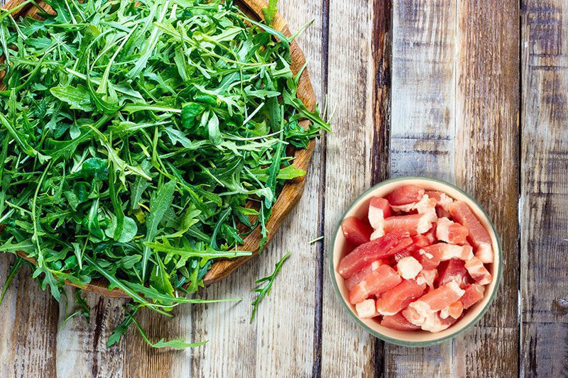 Friggere la rucola per la decorazione, mentre in una padella cuoce il guanciale a quadratini.
