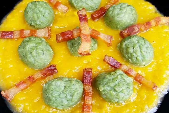 Gnocchi ricotta e spinaci su crema di zucca e bastoncini di pancetta