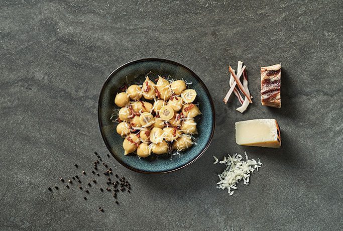 Gnocchi ripieni cacio e pepe con guanciale croccante